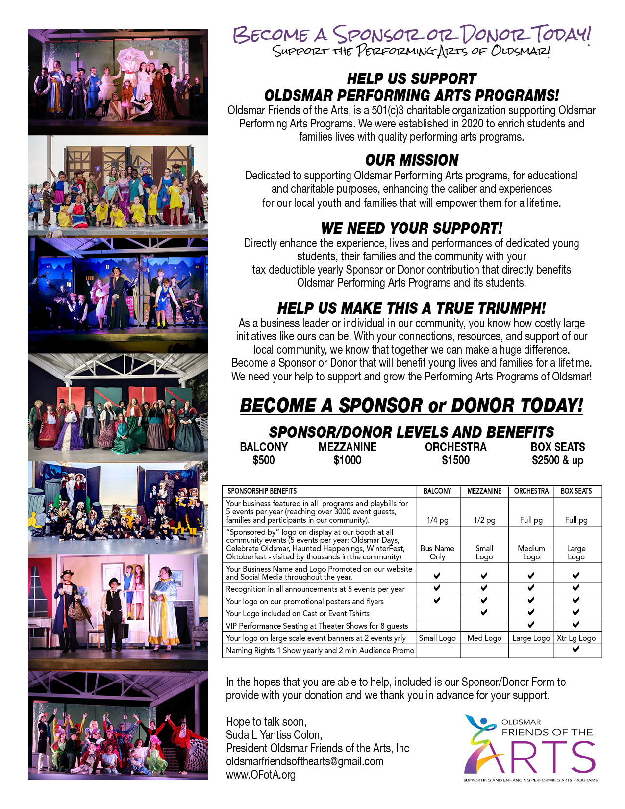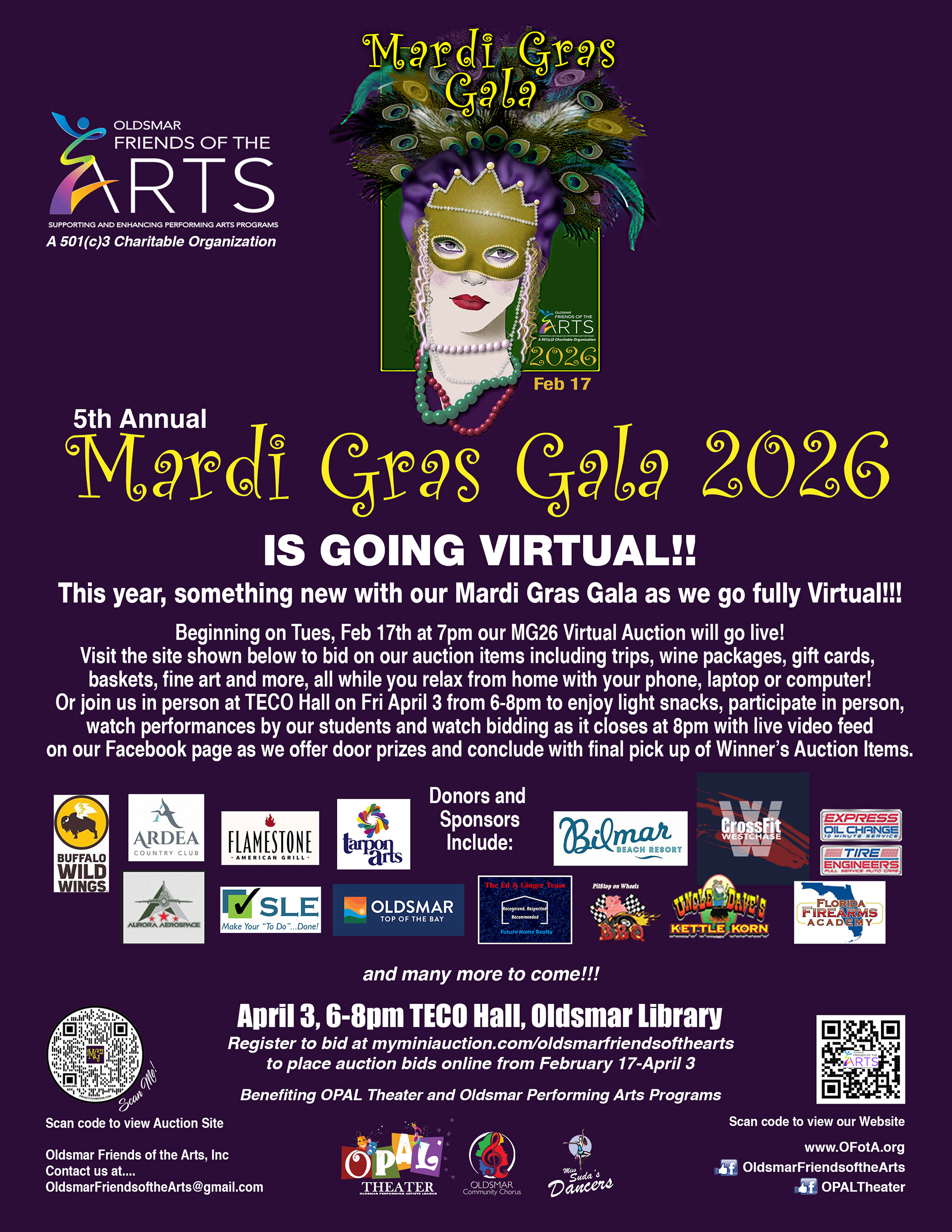 Join us on our mission to support Oldsmar Performing Arts Programs! This year, our event goes fully Virtual! Although we are not having our in person event on Feb 17, we are offering instead our online Virtual Auction and our closing night with entertainment, live feed and Auction Closing. Join us for this new format in our fundraising event.